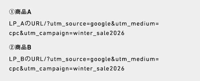 utm_sourceは、Google広告を利用することからgoogleに設定、utm_mediumは、検索広告を利用することからcpcに設定、utm_campaignは、winter_sale2026と命名。これは決めの問題で特にルールはありません。