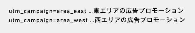 例えば、とある商品のweb広告プロモーションで、特定のエリアに分けて広告配信する際に、それぞれのエリアを識別するために「utm_campaign」の値を 例えば、area_eastとarea_westにのように分類することでそれぞれのエリアのパフォーマンスを広告単位やサイト単位で分析することが可能になります。