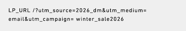 utm_sourceは、2026_dmにしました( ※年数以外に月などを入れたり自由に編集可)。utm_mediumは、メールマーケティングにあたるemailにしました。utm_campaignは、同様にwinter_sale2026しています(※季節にあわせて値名を変更)。