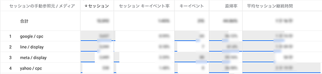 例えば、GoogleやYahooの検索広告、MetaやLINEのディスプレイ広告を同時に運用している場合、各媒体のパフォーマンスを比較検証したい場合もあるでしょう。この場合、Googleアナリティクスの場合では、探索レポートを用いて、ディメンションに「セッションの手動参照元/メディア」を追加し、確認したい指標(例:セッション、セッションキーイベント率、キーイベント、直帰率など)で比較分析に用いることができます。計測対象は特定のLPになるため、「セグメント」もしくは「フィルタ」を用いて、任意のランディングページのみに対象ページを絞り込んでおくことも忘れずに対応しておきましょう。