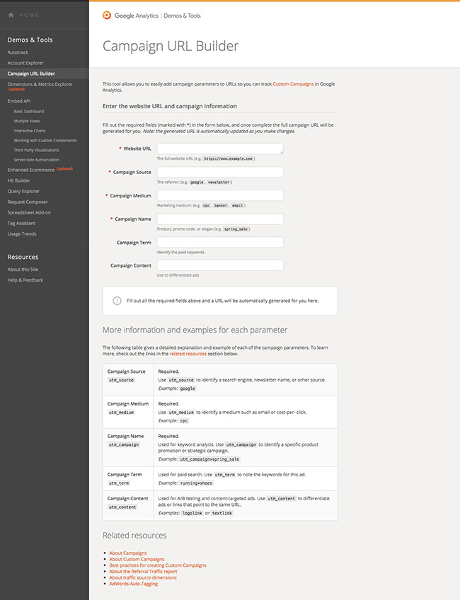 GoogleアナリティクスのヘルプページからCampaign URL Builderにアクセスすることができ、このツールを用いて、各種パラメータを発行することが可能です。