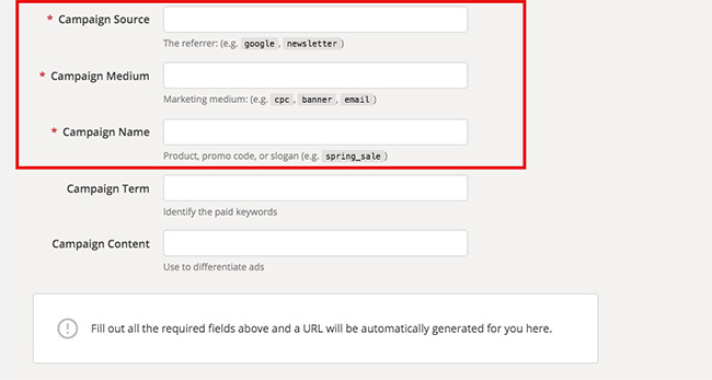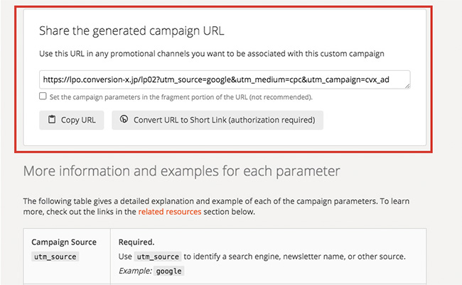 必須項目にあたる、Campaign Source、Campaign Medium、Campaign Nameにそれぞれ任意の値を入力。入力するとリアルタイムで、下部エリアにパラメータが自動生成されていきます。ちなみにCampaign Sourceは、「utm_source」、Campaign Mediumは、「utm_medium」、Campaign Nameは、「utm_campaign」のことを指しています。